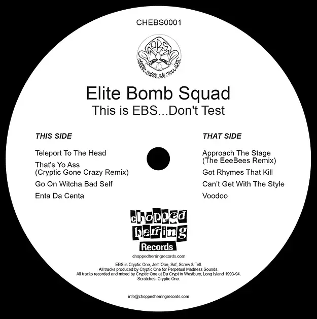 "EBS (Elite Bomb Squad) made their mark in the early '90s as a rap group with a distinct sound and style. Featuring Cryptic One, Jest One, Tell, and Saf as MCs, and Screw as the DJ, the group was known for their experimental, dark beats crafted by Cryptic One, paired with the unique lyrical styles of each MC. The group, active from 1992 to 1994, pursued a record deal, culminating in a meeting with Dr. Dre of Yo! MTV Raps. Though the group disbanded after that meeting, the demo they had presented to Dre later leaked on YouTube, gaining renewed attention and leading to its eventual release on vinyl by Chopped Herring Records in 2024.