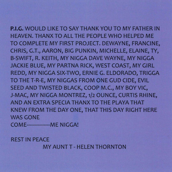 Nearly going unheard for 15+ years, this Ft. Worth stroke of genius is finally seeing a full re-release on Showin' Love Records. P.I.G. was featured on One Gud Cide's 'Terror In The Gulf' from the Look What The Streets Made CD and was set to explode with his solo album set to be released in 1999. CDs were pressed up but never released in stores and most copies were lost forever. Showin' Love is proud to present P.I.G.'s solo album in its entirety, featuring Ernie G on production and a virtual who's who of late 90's Ft. Worth G-Funk, including Twisted Black, Six-2 & 1/2 Ounce.