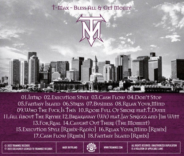 HHE is proud to present the very first release of our Polish fam Trumindz Records! And what a first drop it is! Boston legend T-Max' classic debut album "Bless All Get Money" that was supposed to drop back in 1996. T-Max made some CD-R copies back in 1998 and sold them at shows but they have been proven next to impossible to find. Now in 2023 we finally get a proper pro press with improved tracklist courtesy of Trumindz! Produced by Dow Brain, Brad Young and Danny Wood.